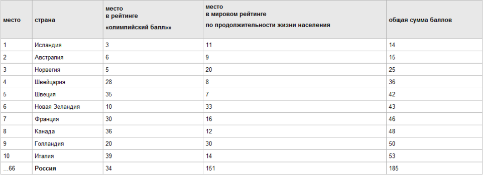 Итоговое положение в рейтинге "самая спортивная страна" определяется по сумме мест двух рейтингов - олимпийского балла и продолжительности жизни.