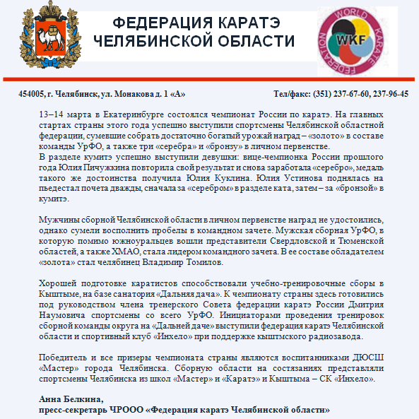 > Сборная Челябинской области успешно выступила на Чемпионате России по каратэ WKF
