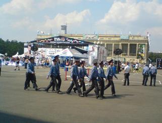 Я обошел Большую спортивную арену (БСА) со стороны трибуны В. Там было много народу. Асфальт расчертили под баскетбольные площадки, на которых молодежь, под присмотром нескончаемой цепочки милиционеров (уже четвертой, см. фото) лениво бросала мячи. Тяжело было ребятам - жара, плавящийся асфальт. Но поскольку это были «нашисты» привезенные с Селигера, мне их было не жалко. Мне стало жалко лохматую служебную немецкую овчарку. Она-то вообще ни за что мучилась на этом празднике жизни.