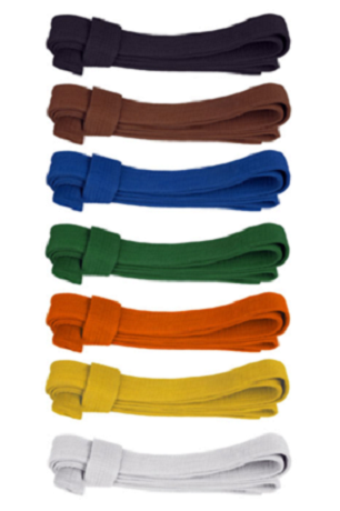 Стандартная система цветных поясов следующая: белый, желтый, зеленый, коричневый и черный. В некоторх школах и стилях - белый, желтый, оранжевый, зеленый, синий, коричневый, черный.
