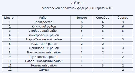 В рейтинге 10 муниципальных районов и 2 городских округа (12 муниципальных образований). Напоминаем нашим читателям, что в Московской области 36 муниципальных района и 38 городских округа (всего 378 муниципальных образований). Путем простых математических подсчетов легко выяснить, что отделения и клубы Московской областной федерации каратэ WKF работают на 3% территории области.