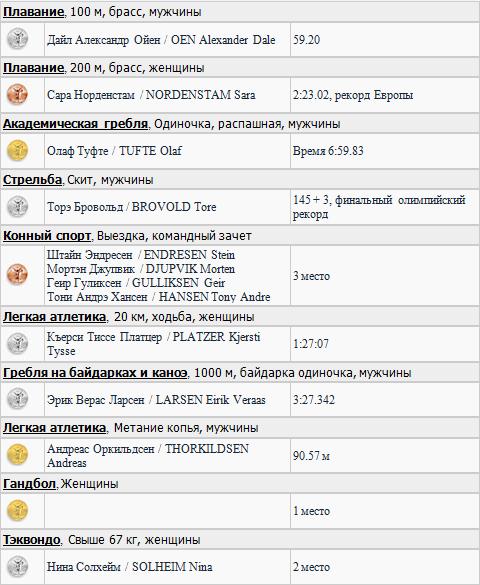 Норвежские спортсмены успешно выступают и в летних видах спорта. На Олимпиаде 2008 года в Пекине они завоевали 3 золотых, 5 серебряных и 2 бронзовых медали.