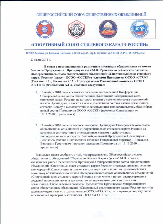 По данным WK, это произошло по совокупности правонарушений – вследствие личного конфликта Михаила Крысина с новым руководством «Союза Стилевого каратэ» и исключения Федерации Косики каратэ из World Koshiki Karate Federation. Теперь Россию в этой международной организации представляет Федерация Спортивного контактного каратэ России, президент А. Филюшкин.