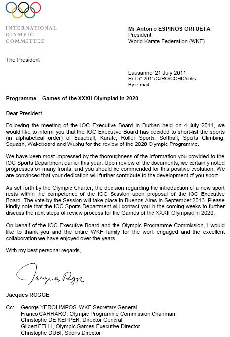 Публикуем ниже письма Джорджа Юролимпуса (WKF) и Жака Рогге (МОК) о номинации каратэ в качестве кандидата на включение в программу Олимпийских Игр 2020 года.