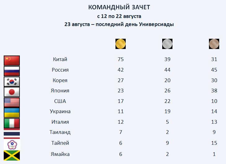 На прошлой Универсиаде в Сербии победителем в командном зачете стала сборная России (27 золотых, 22 серебряных, 27 бронзовых наград). В этот раз на звание лидера претендует сборная Китая, которой поставлена задача победить на «домашней» Универсиаде.