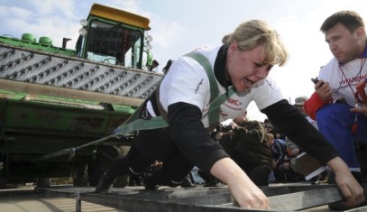 Победила Марина Кигелева и в эстафете. Спортсменки должны были закинуть на стол колесо от джипа весом 40 килограммов, подбежать к компьютерной мышке весом 100 килограммов и протащить этот снаряд 25 метров.
