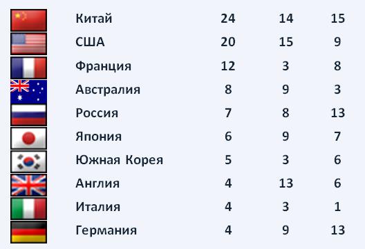 О том, чтобы в предолимпийском году занять хотя бы третье место, и речи быть не может. Остаться бы в первой пятерке, ведь наши основные конкуренты спортсмены Италия, Германии, Англии лидеры в самых медалеемких видах спорта – гребле, фехтовании, велоспорте.