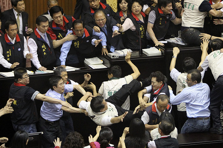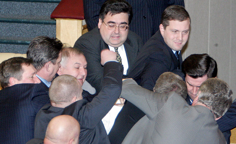 5. Украинская оппозиция против про-президентских законодателей во время обсуждения присутствия российского флота на Черном море. Парламент в Киеве, 2010 год.