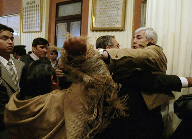 4. Боливийский оппозиционный конгрессмен Fernando Rodriguez (справа) против депутата президентской партии во время сессии конгресса в Ла-Пасе, 2009 год.
