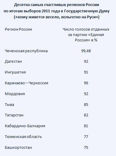 Однако прошедшие 4 декабря выборы в Государственную Думу показали, что не все так однозначно. Есть в России целые регионы, где граждане веселы и счастливы, довольны своей жизнью, властью и окружающим миром.