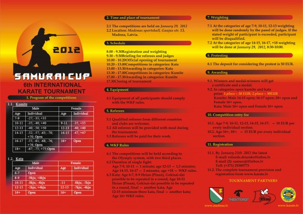 29 января в городе Мадона (Латвия) пройдет традиционный международный турнир Samurai Cup 2012 по каратэ WKF. Организатор – клуб « Samurai». Участники дети от 6 лет, кадеты, юноши, взрослые.