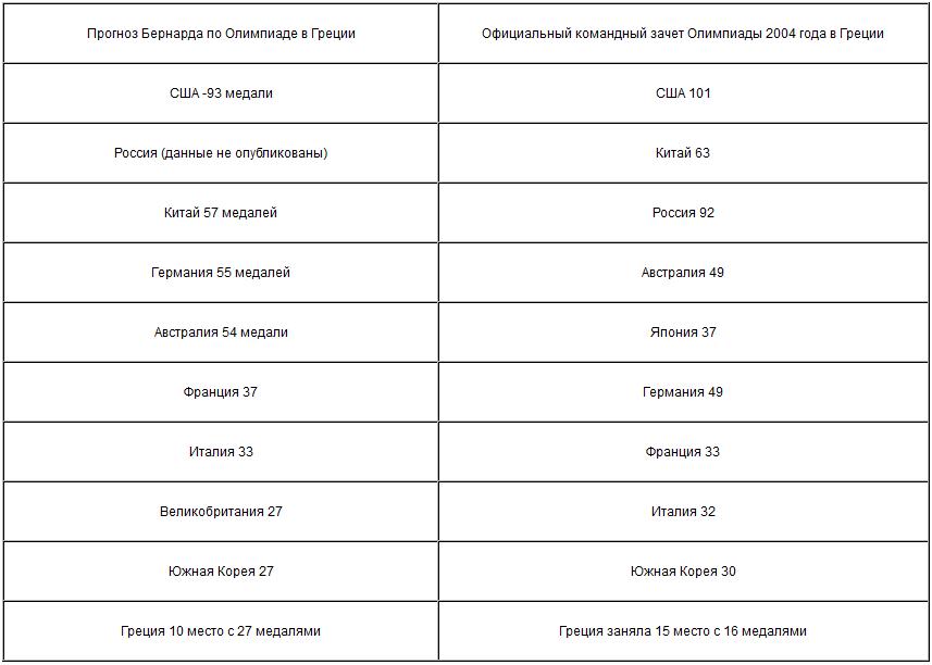 Попробую посомневаться. Ниже приведена сравнительная таблица прогноза Бернарда по Олимпиаде в Греции и официального командного зачета.