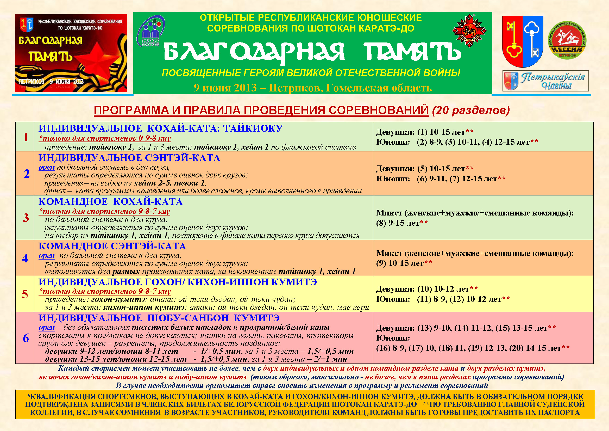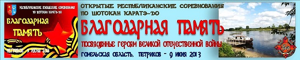 8-9 июня 2013 года, в самом начале летних школьных каникул, в Петрикове - районном центре Гомельской области Беларуси - впервые состоятся открытые республиканские соревнования по сетокан каратэ-до «Благодарная память», посвященные героям Великой Отечественной войны. В программе - выступления спортсменов в возрасте 8-15 лет в 20 разделах для начинающих (kohai) и квалифицированных спортсменов (open). Соревнования проводятся на двух площадках.