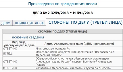Как известно, 31 января 2013 года в Замоскворецкий суд города Москвы поступило исковое заявление от Попова, в котором поздравитель, Федерация каратэ России, значится уже ответчиком. Причем свое намерение подать иск к поздравителю Попов озвучил еще в начале января 2013 года, незадолго до своего дня рождения.