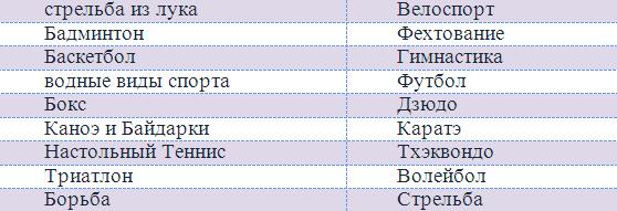 Тем не менее, на сегодняшний день мы можем сказать, что в программу первых олимпийских игр будут включены 18 видов спорта, а к следующим Играм в 2019 году готовятся еще 10 видов спорта.