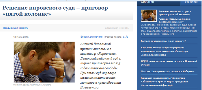 "ЛДПР поддерживает любые приговоры и решения российских судов, направленных на борьбу с коррупцией, мафией, хищениями, на борьбу с «пятой колонной».... Обвинительный приговор Навальному – это предупреждение всей «пятой колонне».