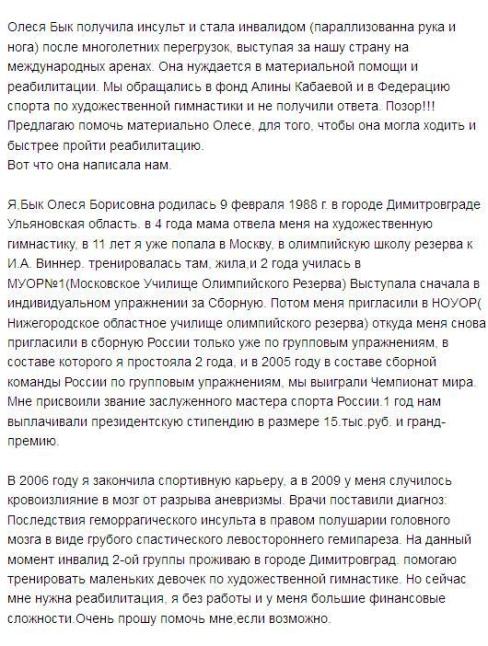 Я привел такую значительную выдержку из статьи Игоря Яковенко в подтверждение тезиса - инвалидность и нужда чемпионки мира по художественной гимнастике не является новостью в России. Журналистам это не интересно. Где все эти Орловы, Губерниевы, Уткины, Набутовы и прочие "сирены великого спортивного будущего страны"? О случившемся сообщил только портал Sports.ru.