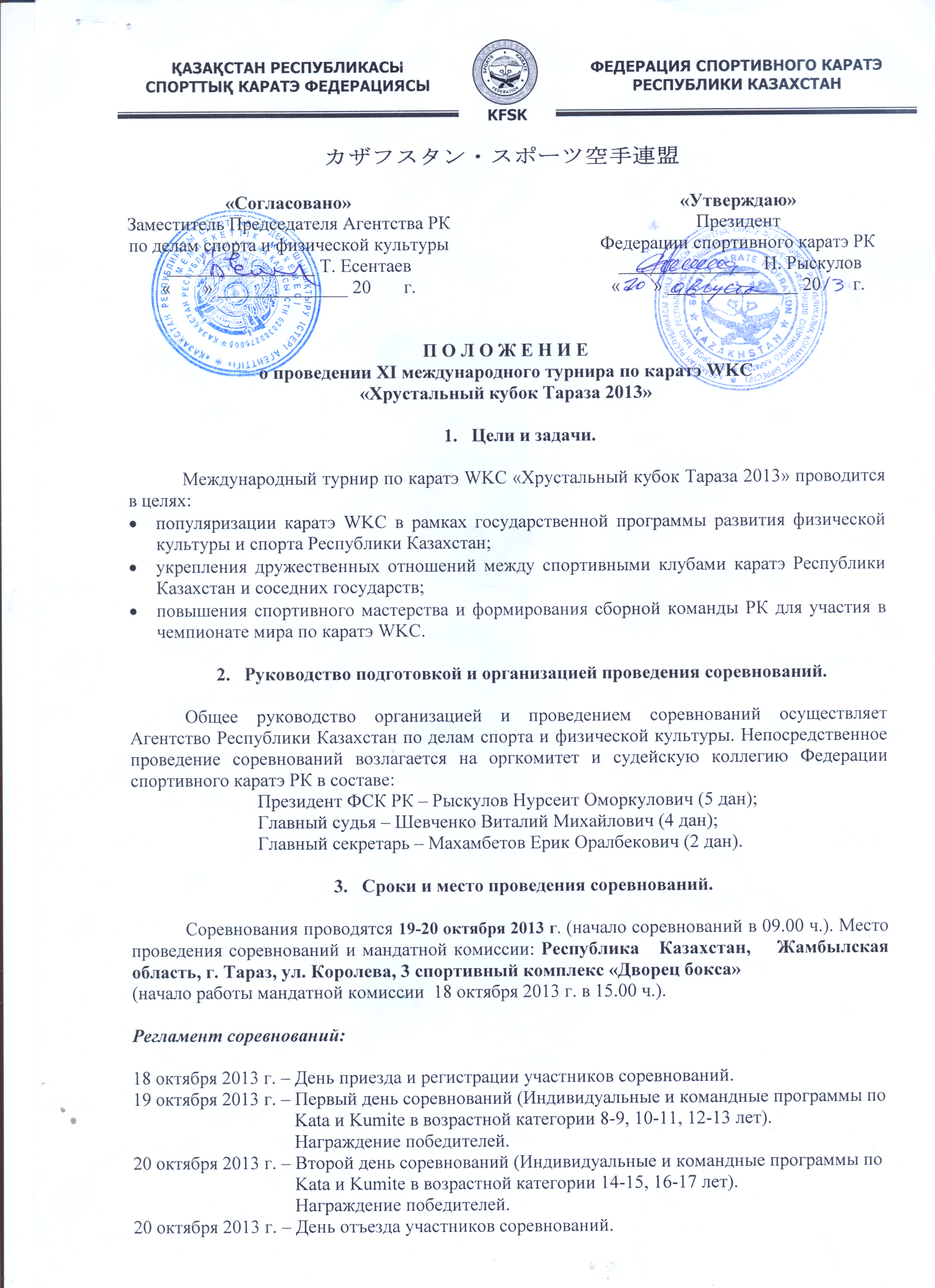 19-20 октября 2013 года в городе Тараз (Казахстан) состоится Международный турнир по каратэ WKC «Хрустальный кубок Тараза 2013».