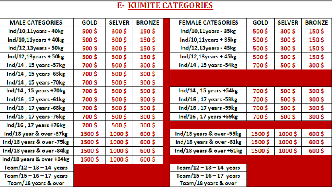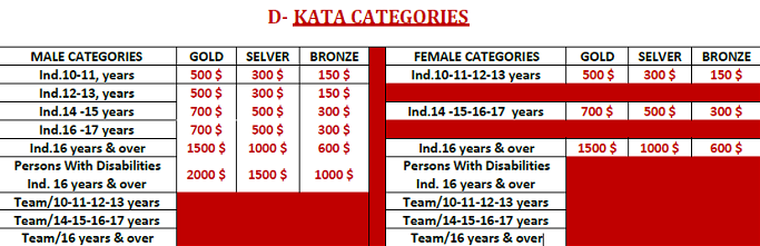 Участие иностранных судей приветствуется. Им выплачивается вознаграждение - судьям национальных категорий - 50 $, континентальных категорий - 75 $, рефери WKF - 100 $ в день.