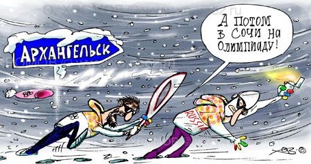 Могла ли в этой новой России эстафета олимпийского огня не превратиться в адский карнавал? Самая длинная в истории эстафета олимпийского огня для самой дорогой в истории олимпиады каждый день даёт поводы для веселья. Чиновники в регионах не знают, как извернуться, чтобы показать, как счастливы они принимать огонь. Его уже и через ледяные реки на себе перевозили закаленные люди, и на дно Байкала опускали (водолаз в костюме, расписанном под хохлому, — и это не со зла, не врагом отечества, не смеха ради придумано, а наверняка из самых чистых побуждений). Огонь летал в космос, огонь катали на собаках, верблюдах, комбайнах и снегоходах.