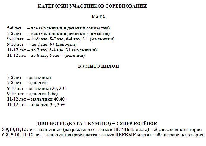 КАТА - соревнования проводятся в два круга (при любом количестве участников). В финальном круге – 6 спортсменов. Оценки кругов складываются.