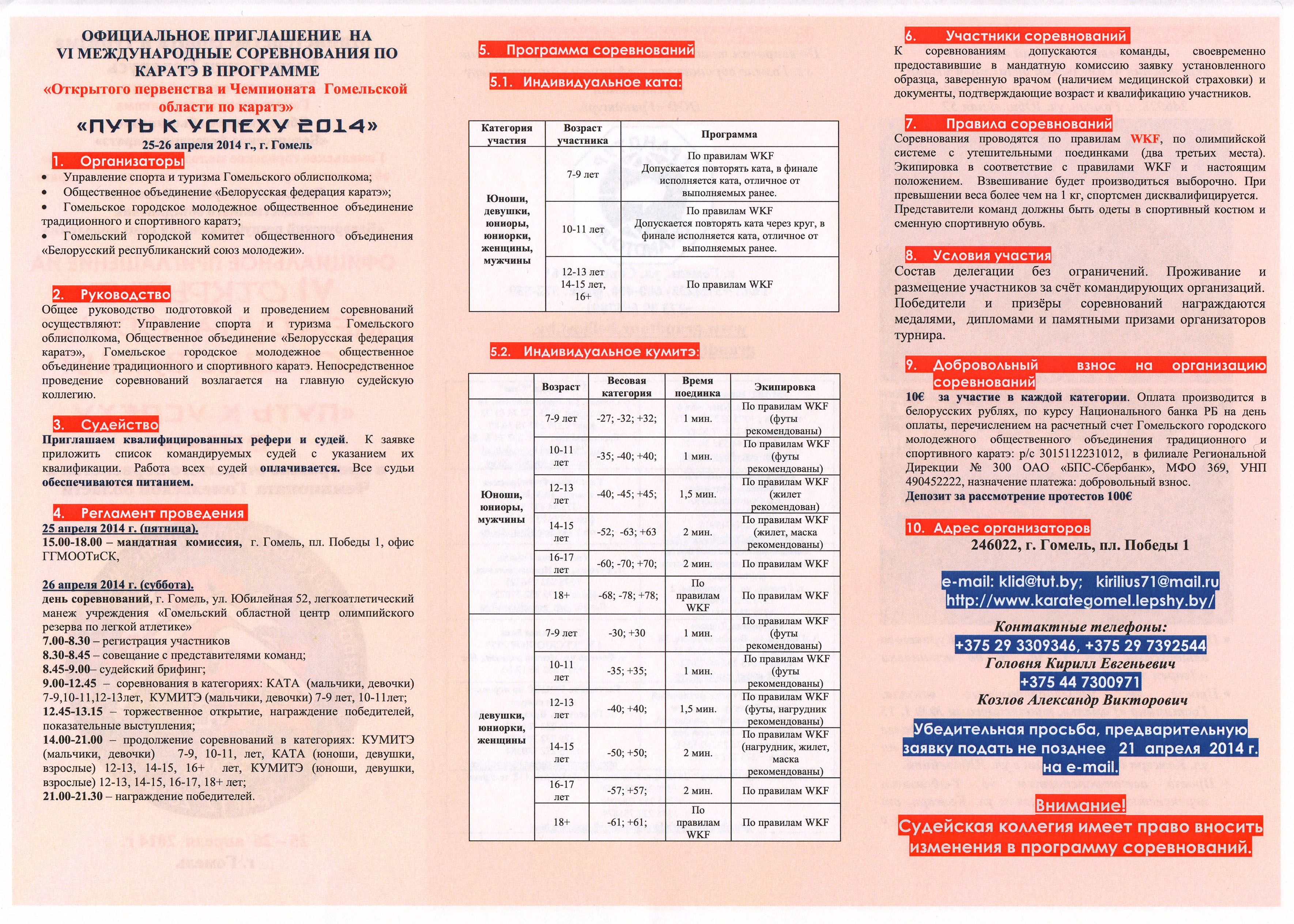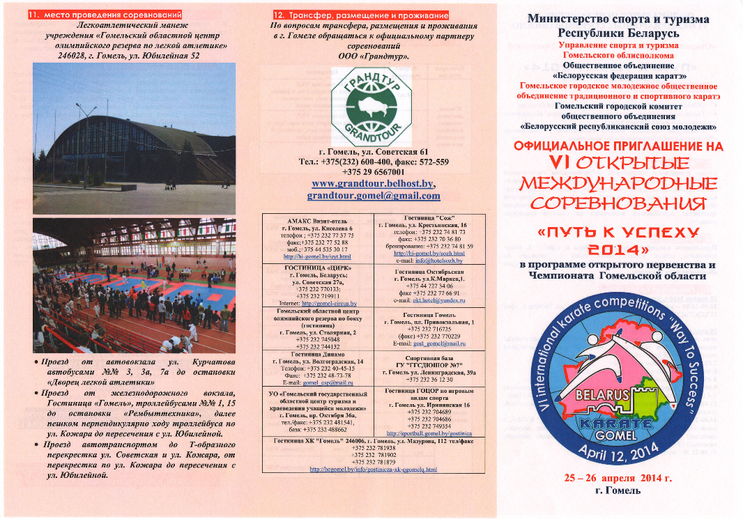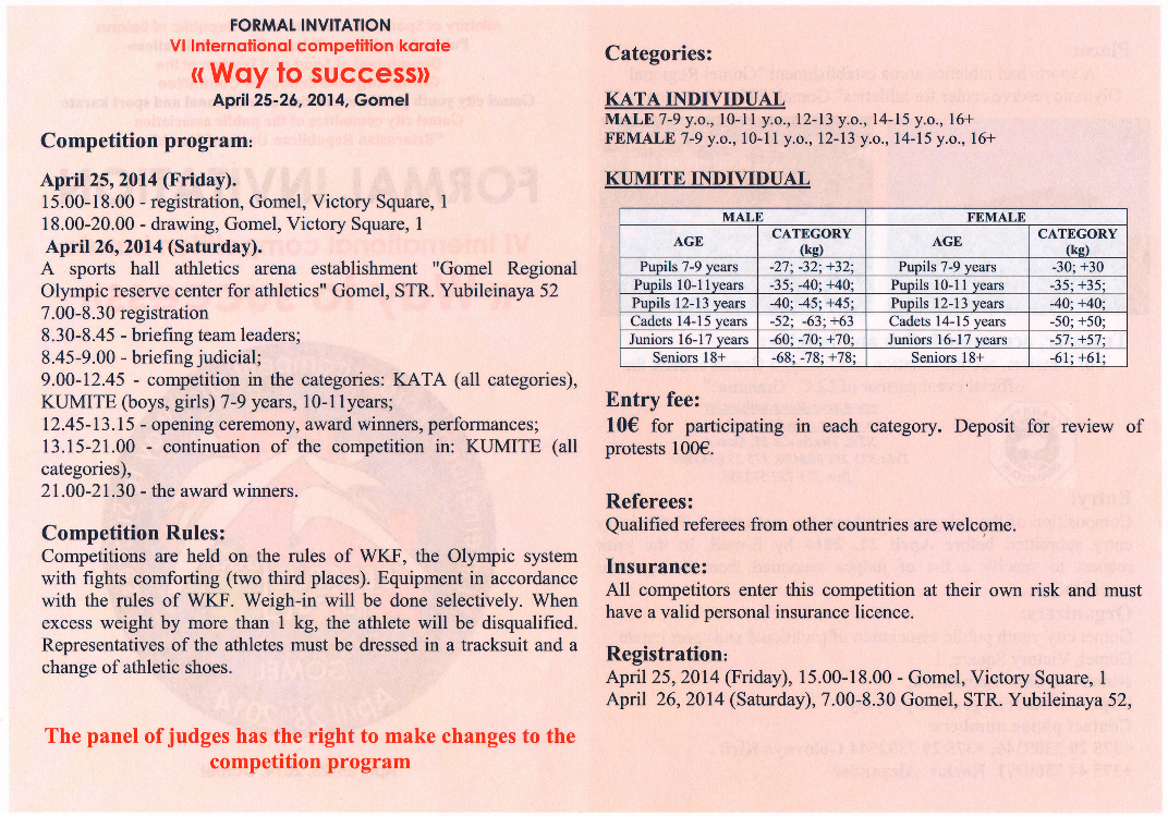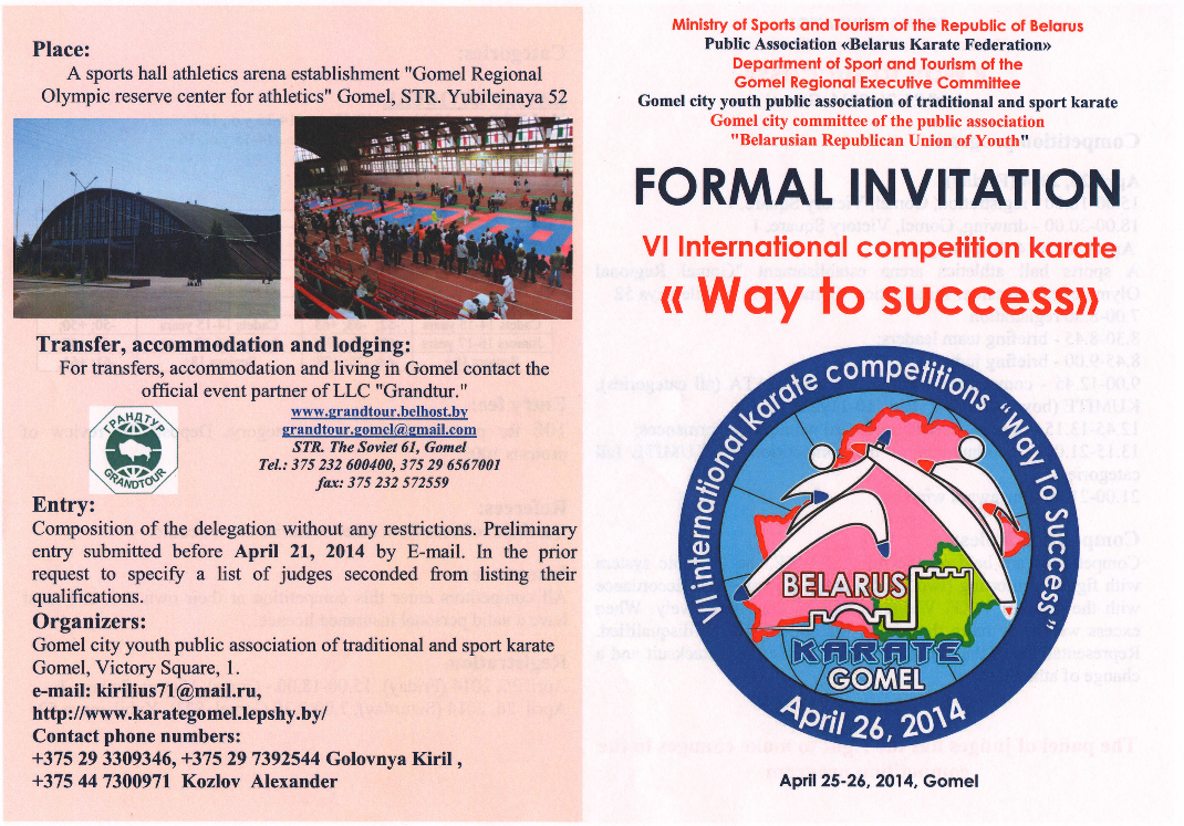 25 и 26 апреля в городе Гомеле пройдет VI международный турнир "Открытое Первенство и Чемпионат Гомеля "Путь к успеху 2014" (International competition karate «Way to success») по каратэ WKF.
