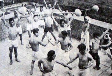 ...Наша машина останавливается возле серого одноэтажного здания — бывшего склада запасных частей к мотоциклам. Его, наскоро перестроив, превратили в тренировочный зал одной из токийских школ каратэ. Спортсмены снимают свои европейские костюмы и облачаются в груботканые кимоно. Служитель вручает каждому пару деревянных колышков. У одного колышки подлиннее и потолще — это уже не новичок; у других совсем коротенькие и со шляпкой. Перед тренировкой спортсмен должен вбить полученные колышки торцами ладоней в землю. Только после этого можно приступить к разминке.
