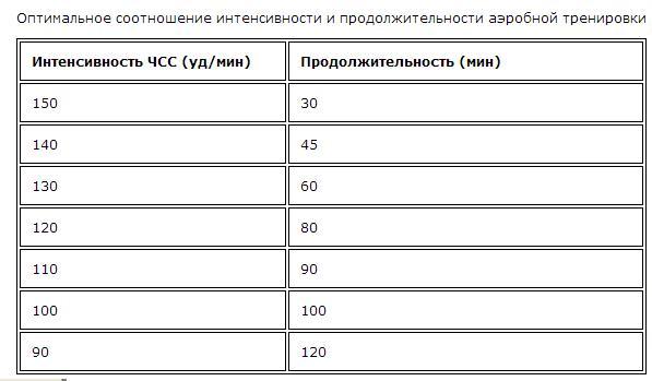 Интересен еще один факт: чтобы набрать необходимые 30 очков по Куперу при беге на месте, требуется, так же как и при прыжках со скакалкой, заниматься всего 15 минут те же 5 раз в неделю. Эти цифры дают наглядное представление об интенсивности работы во время прыжков со скакалкой, потому что по законам спортивной физиологии для достижения необходимого оздоровительного эффекта интенсивность должна быть тем меньше, чем больше продолжительность выполнения упражнения, и наоборот. В общем, низкая интенсивность работы компенсируется увеличением ее продолжительности. Это наглядно иллюстрирует приведенная здесь таблица.