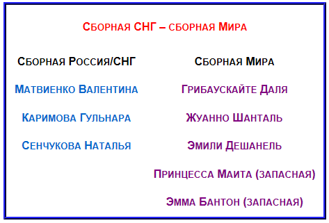 Их оппонентки из сборной Мира активно практиковали каратэ и черные пояса носят по праву. Принцессу Маиту, капитана национальной сборной по каратэ ОАЭ и Эмму Бантон, экс солистку битанской поп-группы Spice Girls, мы поставили запасными исключительно из жалости к российским VIP Данам. Принцесса Маита и Эмма Бантон, в отличие от Дали Грибаускайте, имеют опыт выступления на соревнованиях по каратэ и виртуальный разгром россиянок был бы уж совсем безжалостным.