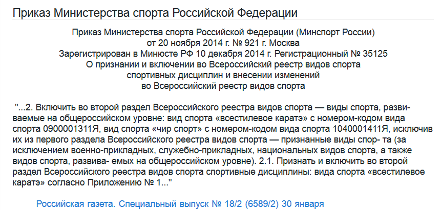 > Приказ Министерства спорта № 921 о признании вида спорта "всестилевое каратэ"