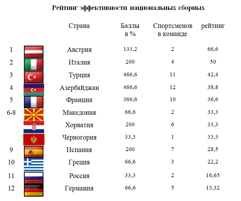 Что получилось. Первое место зачета у Австрии – 2 спортсменки и обе в медалях – серебряные призеры. У Азербайджана четвертое место – 12 спортсменов, из которых 6 в медалях (4-0-2). У Македонии 2 спортсмена – 2 бронзы (6 место), у России 2 спортсмена – 1 бронза (11 место).