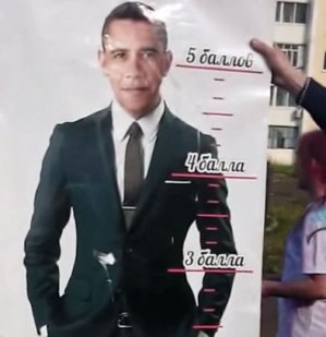 Накануне в Сети появилось видео, на котором подростки участвуют в конкурсе, где баллы начислялись за удары по изображению американского президента. На улице установили плакат с изображением Обамы и шкалой высоты. Больше очков получал тот, кто выше задирал конечность, попадая политику по голове.