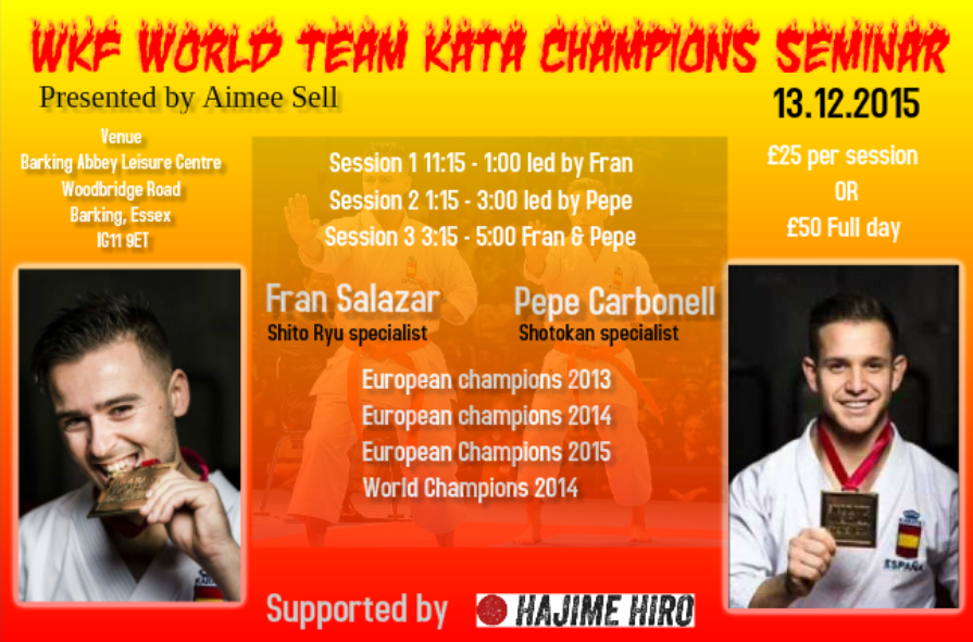 13 декабря в Лондоне пройдет семинар (World WKF Team Kata Champions Seminar) Чемпионов Мира WKF в командных ката Франсиско Салазара (Fran Salazar) и Пепе Лопеса Карбонелла (Pepe Carbonell Lopez).