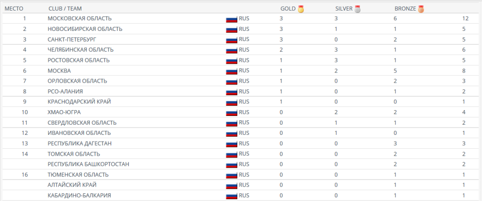 На первом месте командного зачета сборная Московской области (23 участника) – 3 золотых, 3 серебряных, 6 бронзовых наград, на втором сборная Новосибирской области (3-1-1, 20 участников ), на третьем Санкт-Петербурга (3-0-2, 16 участников). Самая многочисленная команда турнира – сборная Москвы (31 участник) на 6 месте командного зачета (1-2-5).