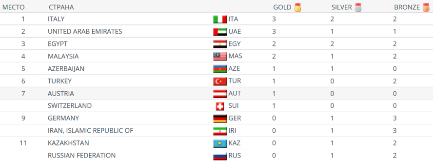 В национальном зачете на первом месте Италия - 3 золота, 2 серебра, 2 бронзы. Россия поделила 11-12 места с Казахстаном (0-1-2). Два французских спортсмена остались без наград.