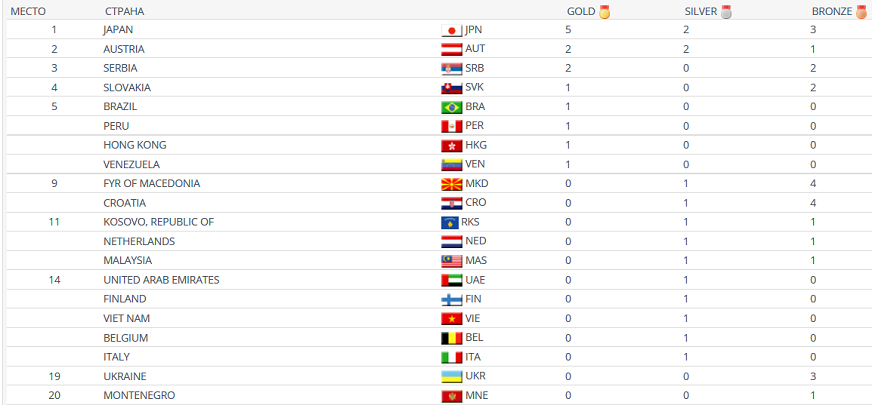 На первом месте национального зачета Япония – 5 золотых, 2 серебряных, 3 бронзовых медали, далее Австрия (2-2-1) и Сербия (2-0-2).
