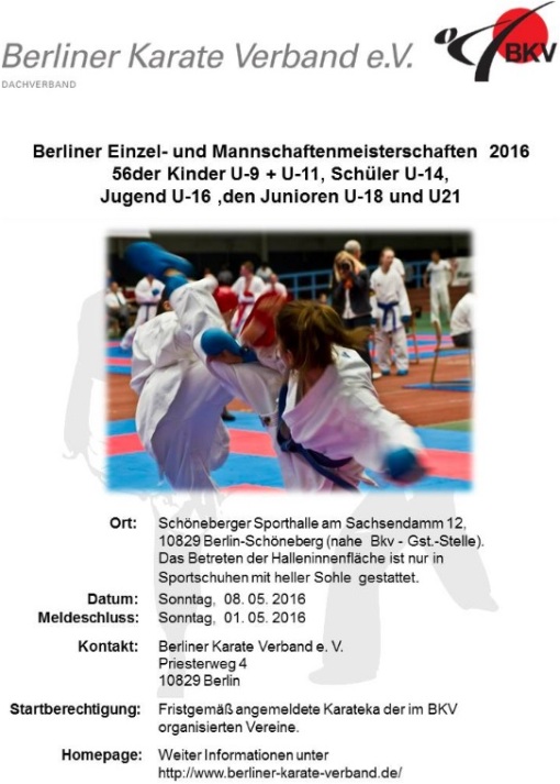 8 мая в Берлине пройдут Чемпионат города среди молодежи и Кубок среди детей, школьников и ветеранов (Berliner Meisterschaft 2016 von Jugend U16, Junioren U18 и Вerlin Cup 2016 von Kinder U8 + U10, Schüler U12 + U14 und Masterklasse Ü30, Ü40, Ü50, Ü60. Нижний возрастной предел участников – 2011 год рождения. Всего 93 индивидуальных и командных вида программы. Стартовый взнос 12 евро.