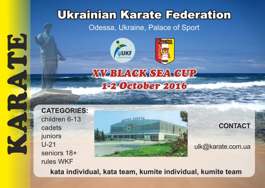 “Кубок Черного моря-2016” включен в план-календарь Украинской Федерации каратэ. Он состоится 1-2 октября 2016 года в Одесском Дворце спорта при поддержке Одесской городской Мэрии.