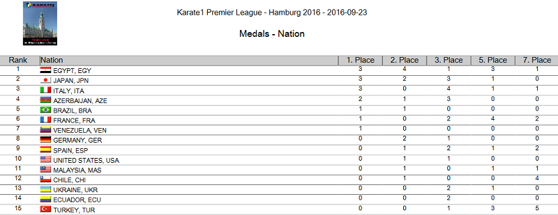 За 9 этапов Премьер Лиги каратэ WKF 2016 года было разыграно 126 комплектов наград. На счету спортсменов Турции 15 золотых медалей, Бразилии и Японии - по 12, Египта - 11, Франции - 8, Марокко – 7.