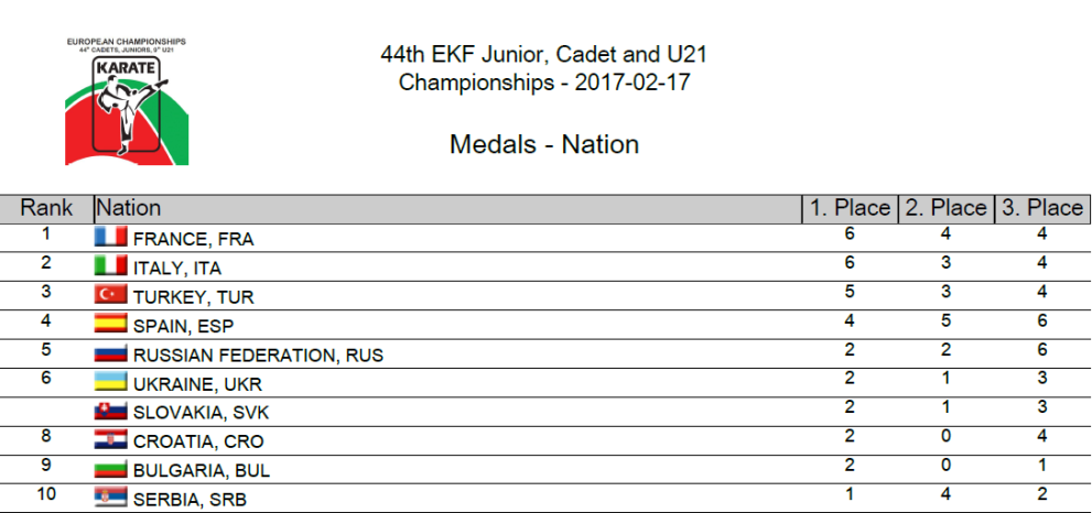 Сборная России завоевала 2 золотых, 2 серебряных и 6 бронзовых медалей, в том числе у кадетов – 2 золота, 1 серебро, 1 бронза, у юношей – 0-1-2, юниоров 18-20 лет – 0-0-3. Вот уж действительно «Дети у Вас хорошие, но все, что Вы делаете руками….» – по мере взросления результаты российских каратистов WKF падают и сходят на ноль у взрослых спортсменов. Если бы WKF проводила Чемпионаты для детей с 8 лет, то россияне были бы лидерами национального зачёта.