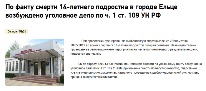 В Ельце на тренировке по кикбоксингу погиб 14-летний спортсмен