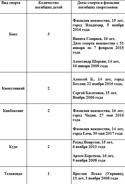 Российскими законами запрещено публикация фамилий и имен погибших детей. Поэтому с 2016 года павшие в поединках нокаут-единоборств юные спортсмены остаются безымянными.