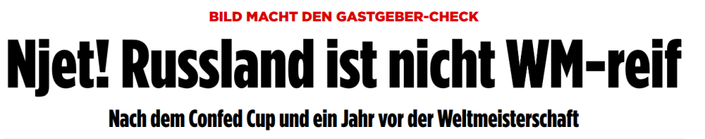 Спустя 17 дней после начала футбольного Кубка конфедераций в России немецкий таблоид Bild решил подвести итоги и пришел к выводу, что "Россия не созрела до ЧМ-2018". Издание выставило России оценки по различным аспектам.