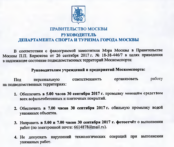 Руководитель московского ЖКХ дает идиотское указание руководитю Департаменту спорта и туризма Москвы, а последний транслирует его подведомственным спортшколам.