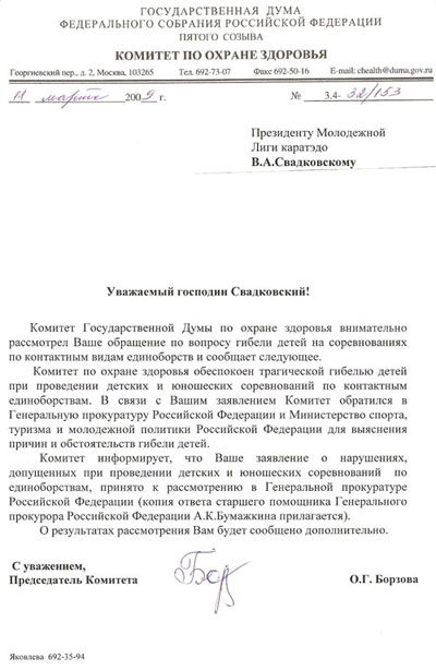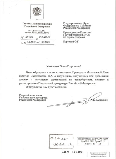 4. Направит тексты правил всех федераций по контактным единоборствам в НИИ Прокуратуры, на предмет получения заключения об их соответствии нормам уголовного кодекса Российской Федерации.